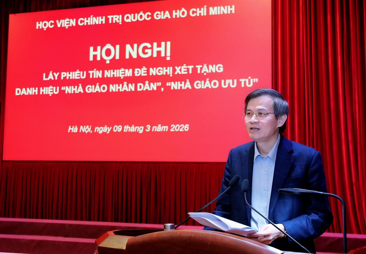 Chiều ngày 09/03/2026, tại Hà Nội, Học viện Chính trị quốc gia Hồ Chí Minh tổ chức Hội nghị lấy ý kiến và bỏ phiếu tín nhiệm đối với các ứng viên đề nghị xét tặng danh hiệu Nhà giáo ưu tú. PGS,TS Đoàn Minh Huấn, Ủy viên Bộ Chính trị, Bí thư Đảng ủy, Giám đốc Học viện dự và chủ trì hội nghị.