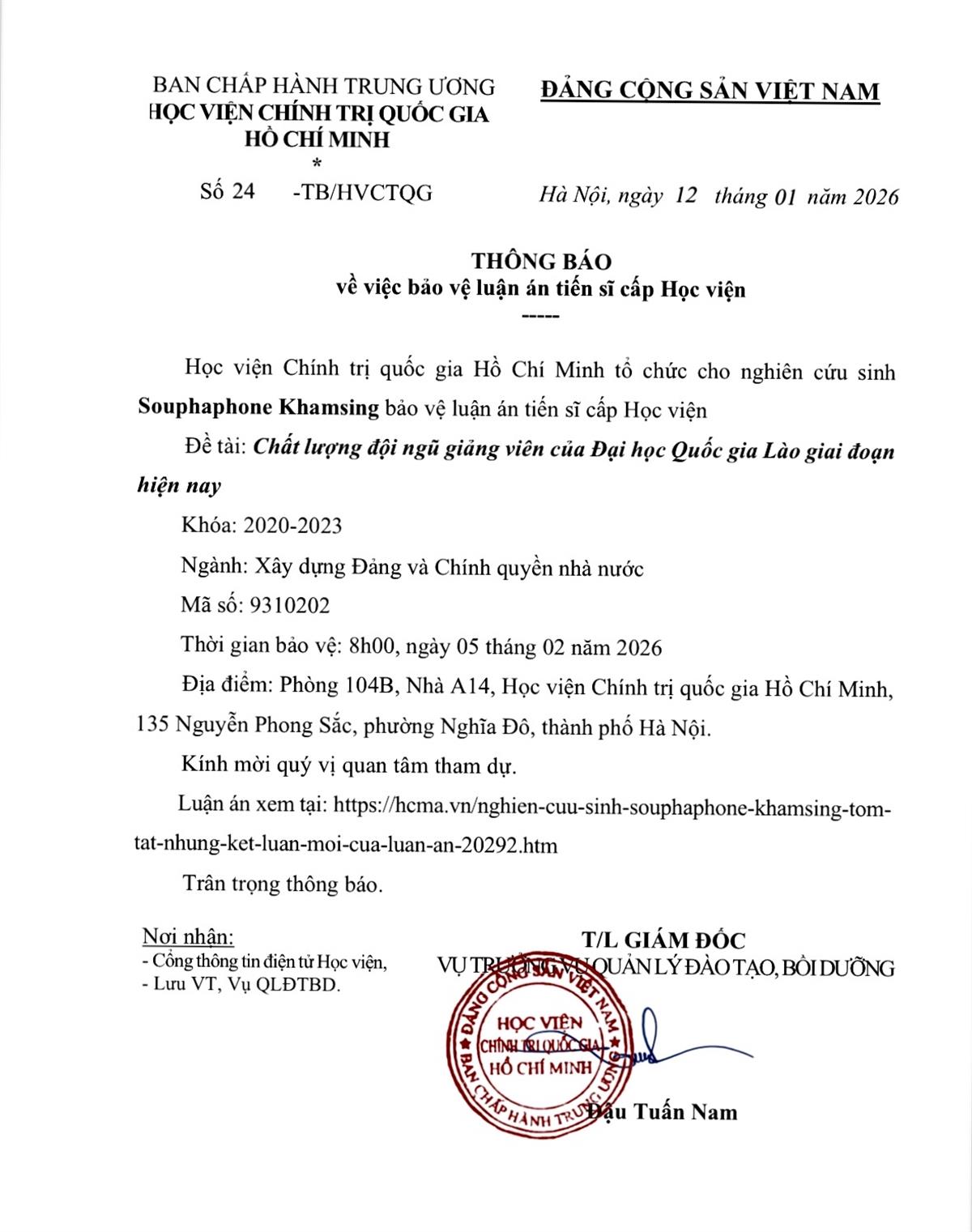 Thông báo bảo vệ luận án tiến sĩ cho Nghiên cứu sinh Souphaphone Khamsing
