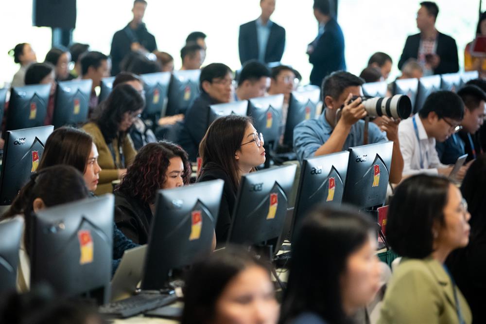 Các phóng viên tại Trung tâm Báo chí Đại hội XIV của Đảng