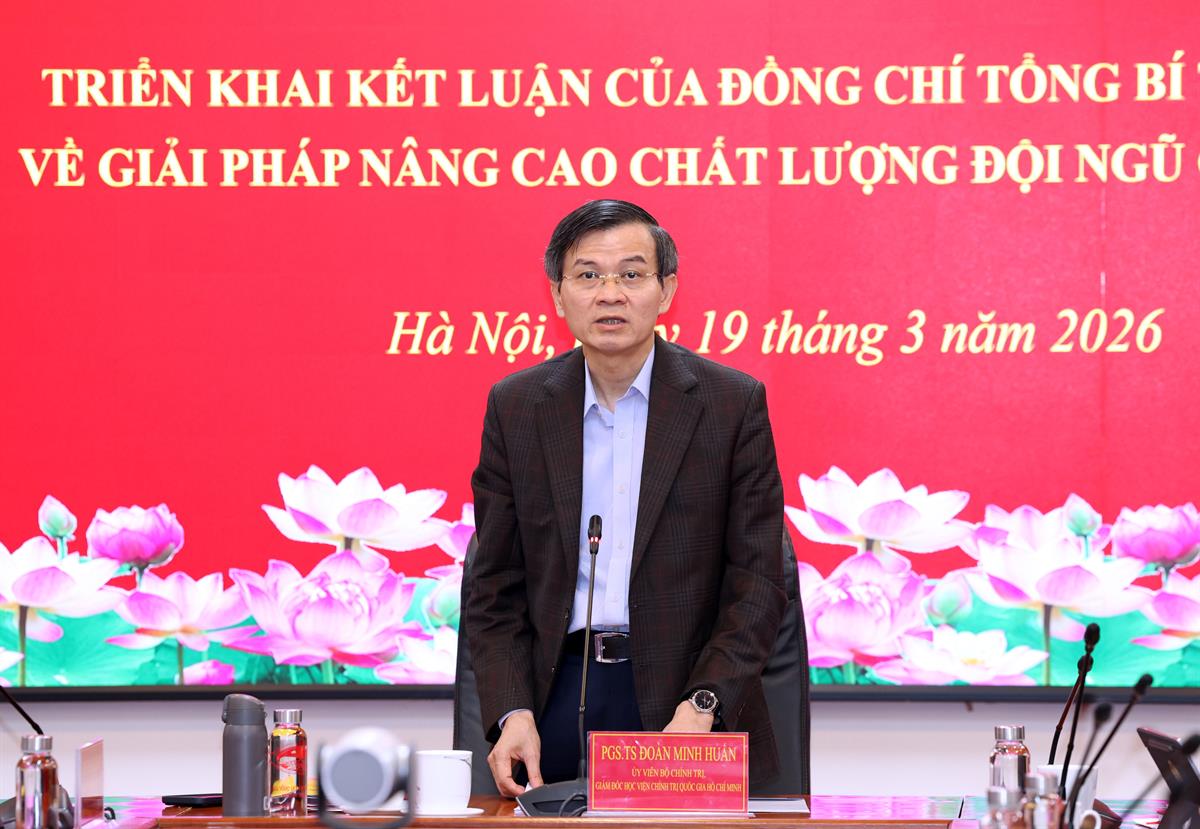 Sáng ngày 19/03/2026, Học viện Chính trị quốc gia Hồ Chí Minh tổ chức Hội nghị triển khai Kết luận của đồng chí Tổng Bí thư Tô Lâm về giải pháp nâng cao chất lượng đội ngũ cán bộ cơ sở. PGS,TS Đoàn Minh Huấn, Ủy viên Bộ Chính trị, Giám đốc Học viện Chính trị quốc gia Hồ Chí Minh dự và chủ trì hội nghị.