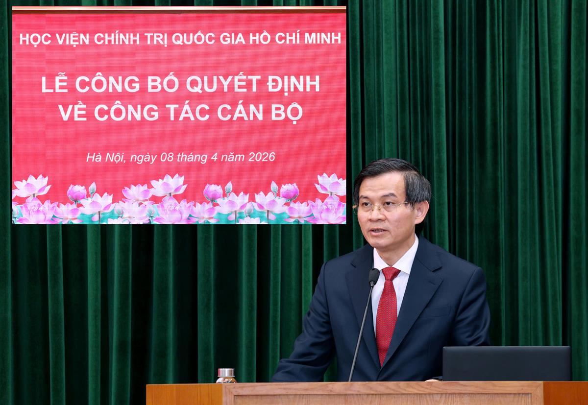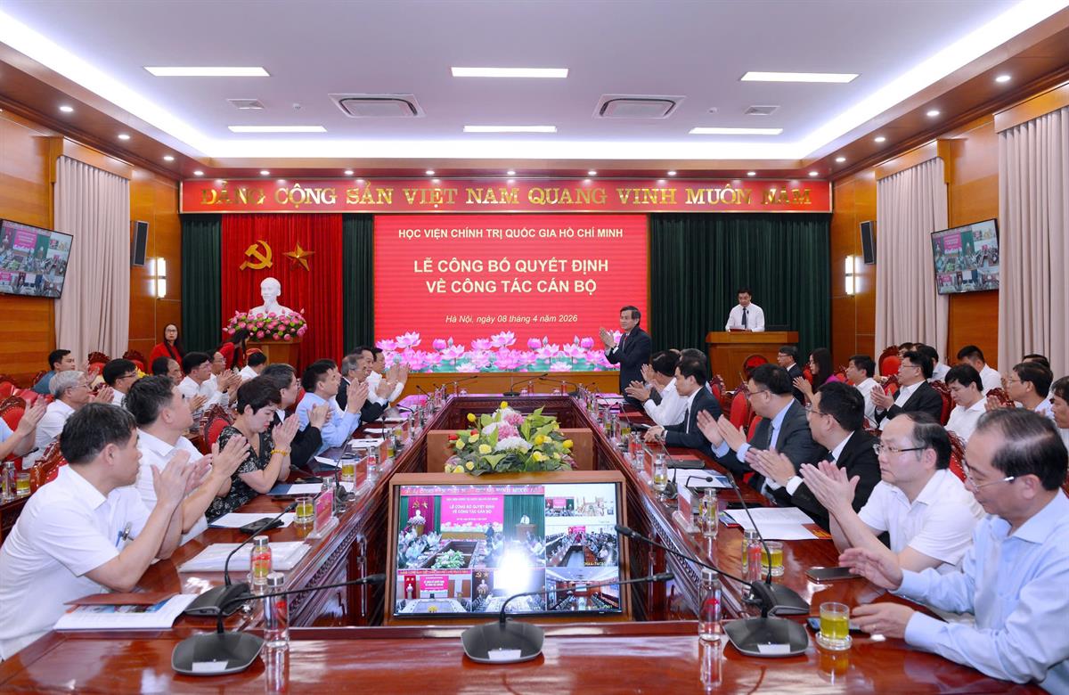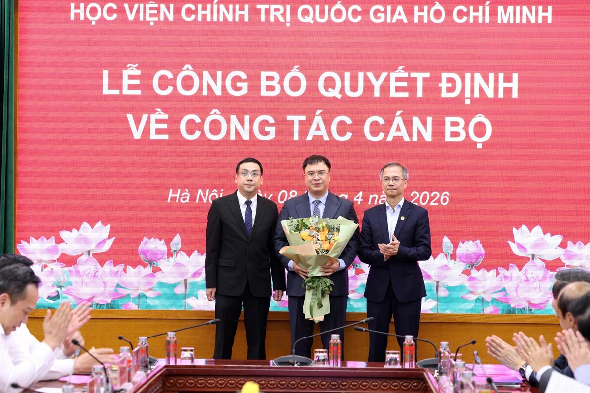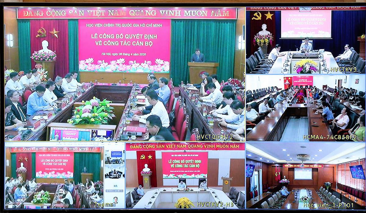 Chiều ngày 08/4/2026, tại Hà Nội, Học viện Chính trị quốc gia Hồ Chí Minh tổ chức Lễ công bố quyết định bổ nhiệm Trợ lý, Thư ký đồng chí Uỷ viên Bộ Chính trị, Giám đốc Học viện Chính trị quốc gia Hồ Chí Minh. Lễ công bố được kết nối trực tuyến đến 06 điểm cầu các Học viện trực thuộc. PGS,TS Đoàn Minh Huấn, Uỷ viên Bộ Chính trị, Bí thư Đảng uỷ, Giám đốc Học viện Chính trị quốc gia Hồ Chí Minh dự và chủ trì buổi Lễ.