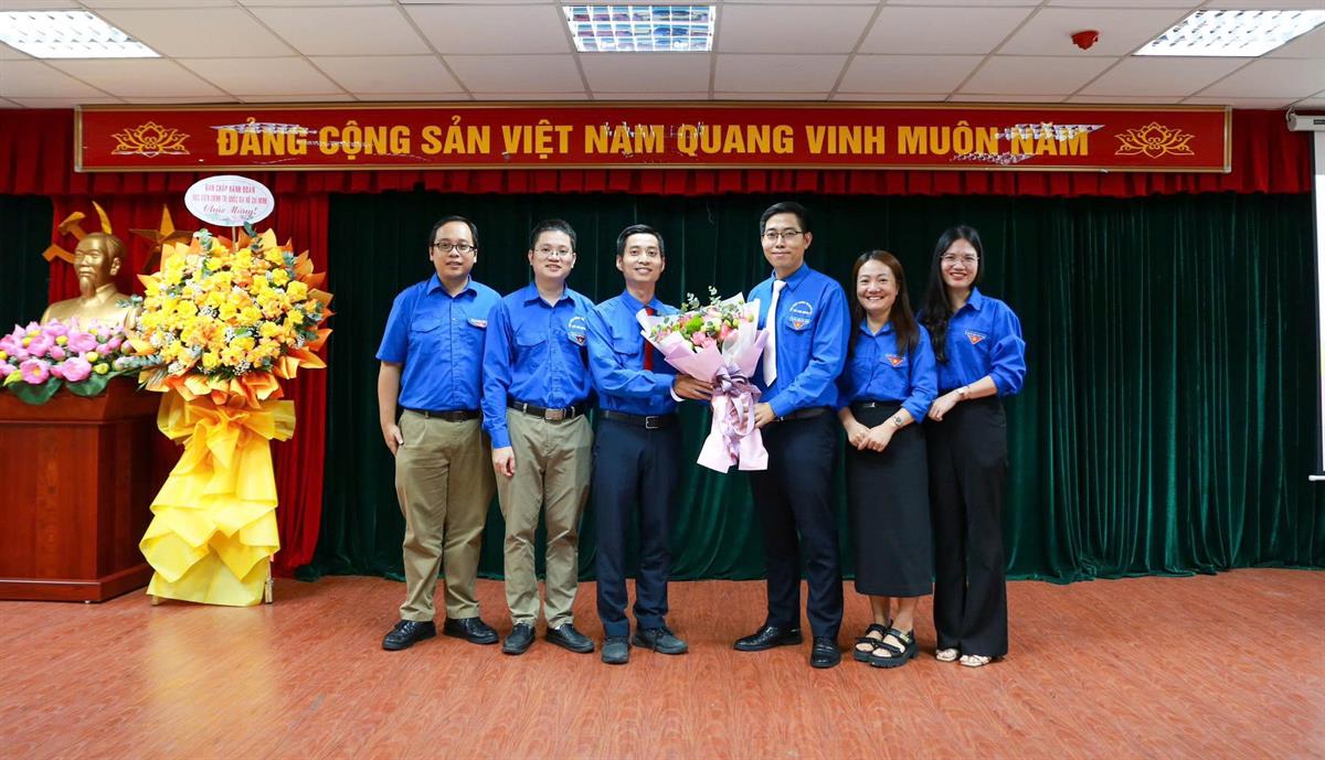 Đồng chí Đinh Trung Sơn, Phó Bí thư Đoàn Thanh niên Học viện Chính trị quốc gia Hồ Chí Minh tặng hoa chúc mừng Ban Chấp hành Đoàn Thanh niên Khối Nghiên cứu - Giảng dạy nhiệm kỳ 2025 – 2030 vừa được bầu tại Đại hội
