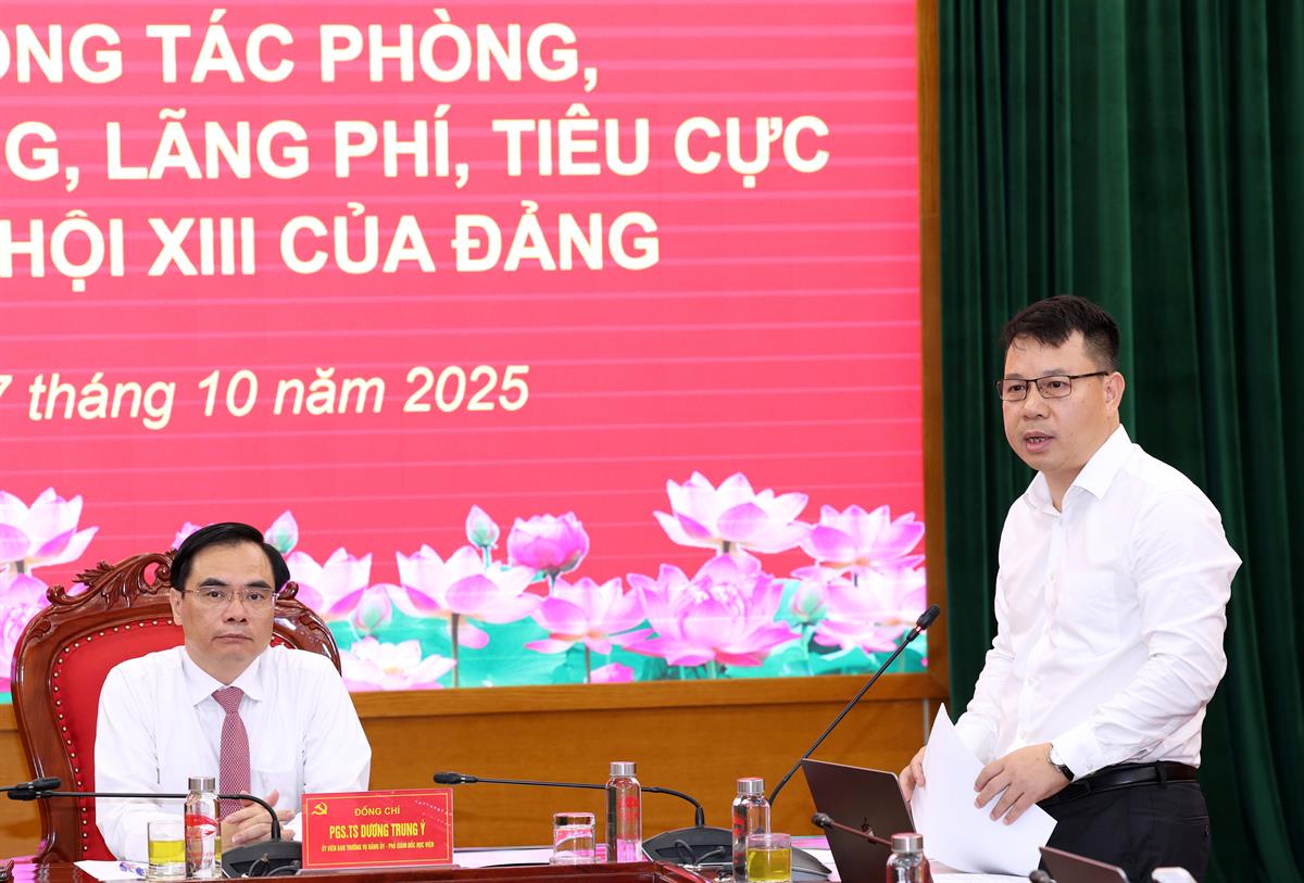 Phát biểu chỉ đạo, khai mạc Hội nghị, PGS,TS Dương Trung Ý, Uỷ viên Ban Thường vụ, Chủ nhiệm Uỷ ban Kiểm tra Đảng uỷ, Phó Giám đốc Học viện Chính trị quốc gia Hồ Chí Minh nhấn mạnh, công tác phòng, chống tham nhũng, lãng phí, tiêu cực là “một nhiệm vụ đặc biệt quan trọng trong công tác xây dựng, chỉnh đốn Đảng, xây dựng, củng cố hệ thống chính trị trong sạch, vững mạnh, củng cố khối đại đoàn kết toàn dân tộc”, góp phần giữ gìn thành quả cách mạng; là một trong những đòi hỏi cấp bách và xuyên suốt của các cấp ủy Đảng. Thực hiện tốt công tác phòng, chống tham nhũng, lãng phí, tiêu cực chính là việc phát huy những nhân tố tích cực, giúp phòng ngừa sai phạm một cách chủ động, góp phần nâng cao hiệu năng, hiệu lực, hiệu quả của công tác quản lý và là một trong những nhiệm vụ trọng tâm, có vai trò đặc biệt quan trọng trong công tác lãnh đạo, chỉ đạo của cấp ủy, tổ chức Đảng và người đứng đầu các cấp trong hệ thống chính trị, nhất là trong giai đoạn hiện nay như lời đồng chí Tổng Bí thư Tô Lâm đã nói: “Trước yêu cầu tăng cường nguồn lực, khơi dậy sức dân đưa đất nước bước vào kỷ nguyên mới dưới sự lãnh đạo của Đảng, công tác phòng, chống lãng phí đang đứng trước những yêu cầu, nhiệm vụ mới rất khẩn trương, cấp bách”.