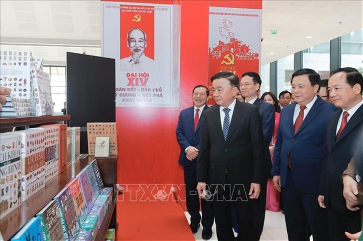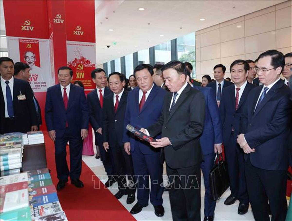 Politburo Member and Standing member of the Party Central Committee's Secretariat Tran Cam Tu and delegates visit the book and newspaper exhibition area serving the Congress